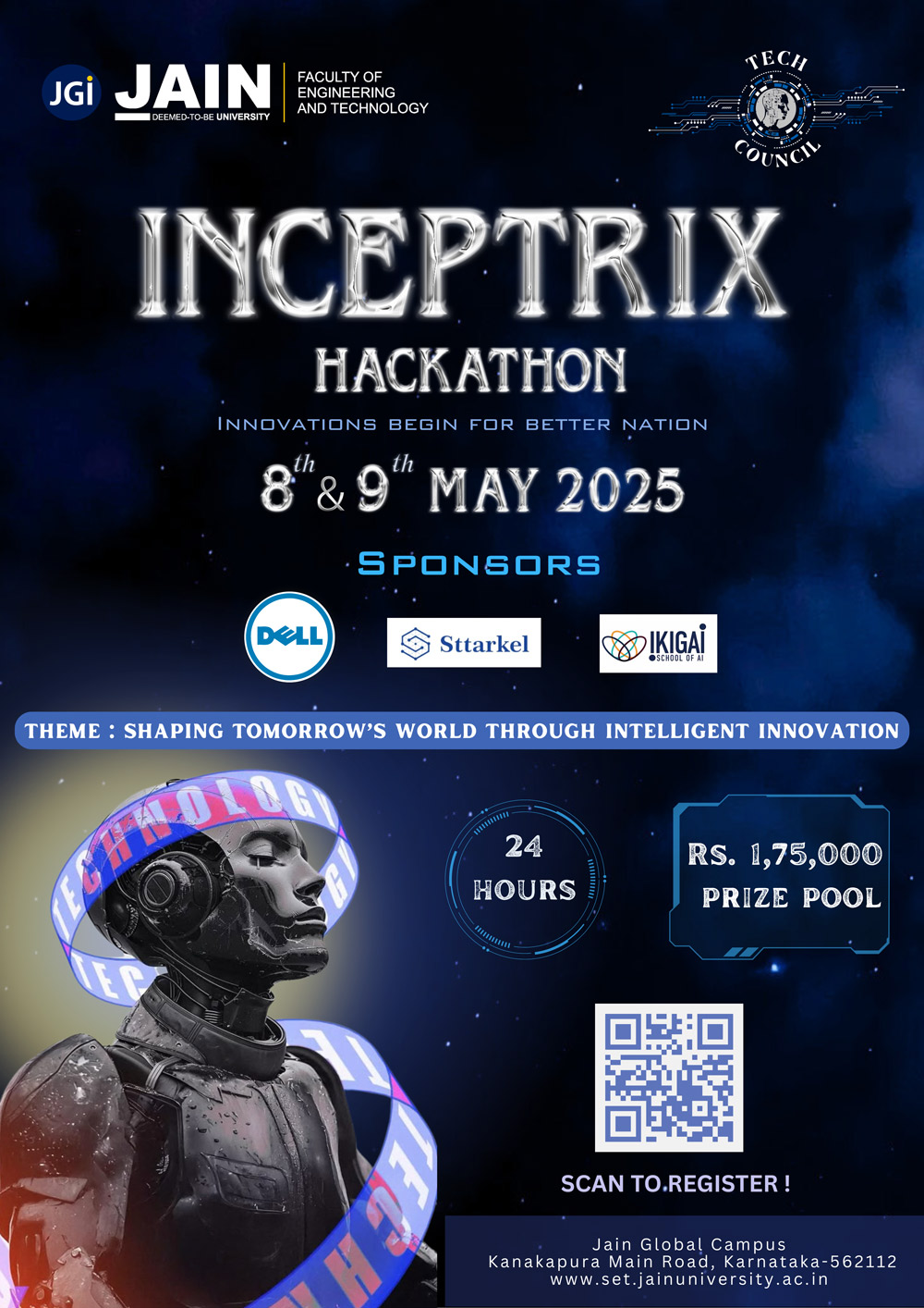 Inceptrix 2025 is a premier 24-hour innovation sprint designed to foster creative problem-solving and interdisciplinary collaboration among aspiring innovators. Scheduled to take place on May 8th and 9th, 2025, at the JAIN Global Campus, the event invites participants to engage in intensive ideation and prototype development under the guidance of experienced industry professionals.