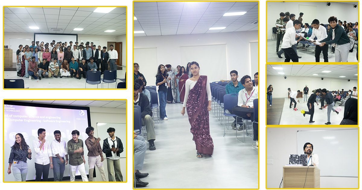 The event commenced with a warm welcome address by the faculty coordinators, followed by an introduction to the FOSS Club and its role in promoting technical engagement and student collaboration. Dr Santhosh S, Programme Coordinator, inspired students with his address on the value of communication and teamwork in shaping a successful academic journey. Faculty members Dr Ramesh Babu, Associate Professor; Dr Janarthanan Sekar, Assistant Professor; and Mr Karthikeyan, Assistant Professor, also addressed the gathering, motivating students to make the most of their university experience.
