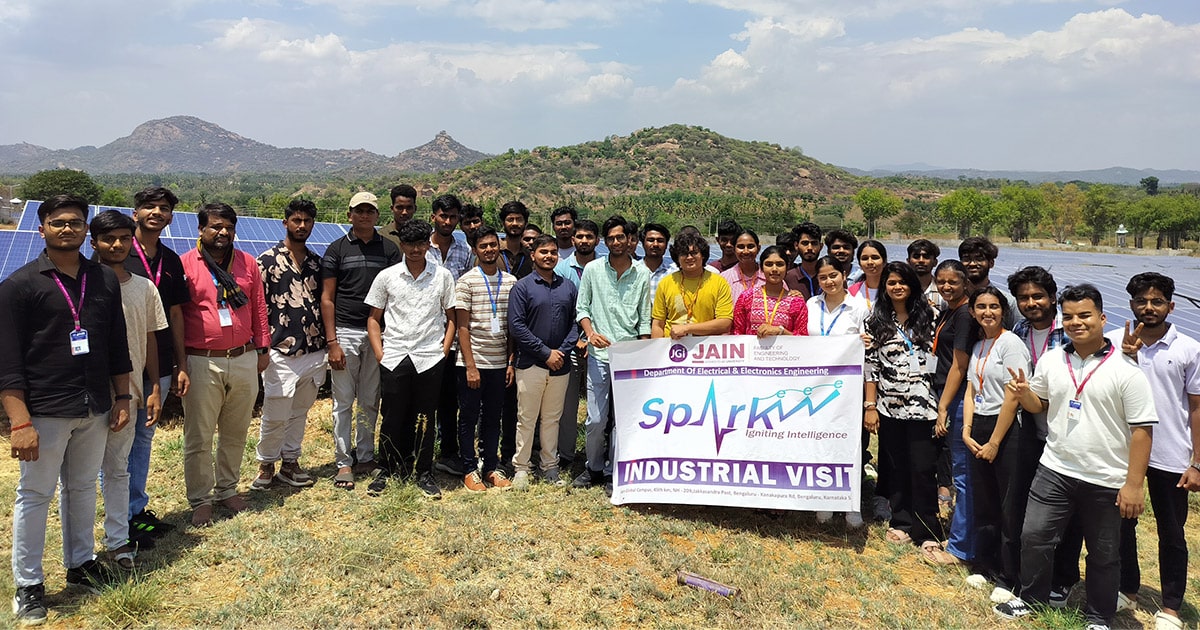 Jain (Deemed-to-be University), School of Engineering and Technology organized industrial visit to Solar Power Plant in Doddalahalli on 17 October 2019. A batch of 47 students accompanied by 4 faculty members started their journey to explore the core of electrical sciences. This power plant is a private based plant. It consists of thousands of solar panels distributed over a vast area of land (75 hectare). The total power generated by this power plant is 20MW. The solar energy here is converted into electrical energy with the help of solar panels each separated from one another with a certain tolerance and fixed at a maximum productive angle. There were two different control rooms that monitored the working of the entire power plant. One control room monitored the power output (DC to AC conversion) of 4MW * 5units and the other control room monitored a power output of 66 kV (11kV to 66 kV Conversion). Continuous monitoring of the output is taken care of by the personnel operating in the control room. The maximum output from this plant is achieved from 7am to 5pm after which this plant comes to a standstill. Any problem occurring with the panel is easily detected at the control room and is immediately changed.