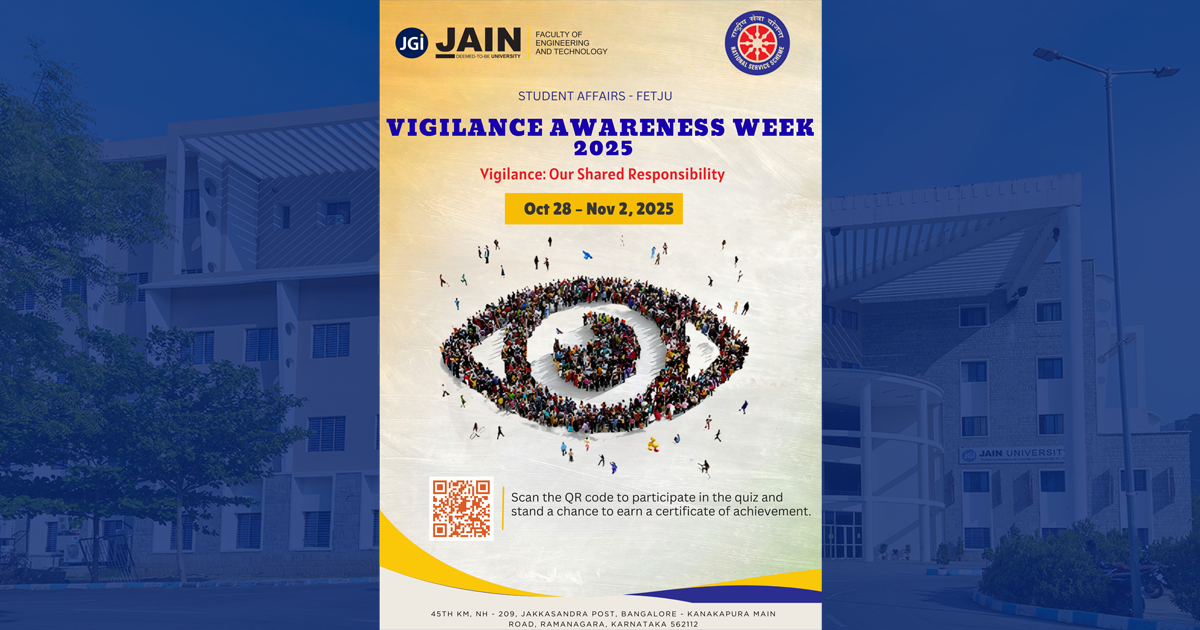 Kanakapura, November 5, 2025: The NSS Wing of the Faculty of Engineering and Technology, JAIN (Deemed-to-be-University), successfully organised a National-Level Online Quiz from October 28 to November 2, 2025, as part of Vigilance Awareness Week 2025. The event was conducted under the national theme “Vigilance – A Shared Responsibility”, aligning with the vision of promoting transparency, integrity, and ethical conduct among the youth.