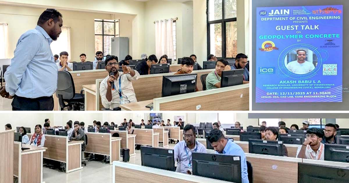 Bengaluru: The Department of Civil Engineering at JAIN (Deemed-to-be University) organised a specialised Guest Lecture on “Geopolymer Concrete” on 12 November 2025 at the School of Engineering and Technology campus, Bengaluru. The session was delivered by Mr Akash Babu L., a Research Scholar at the University Visvesvaraya College of Engineering (UVCE), and was attended by students and faculty members, who actively participated.
