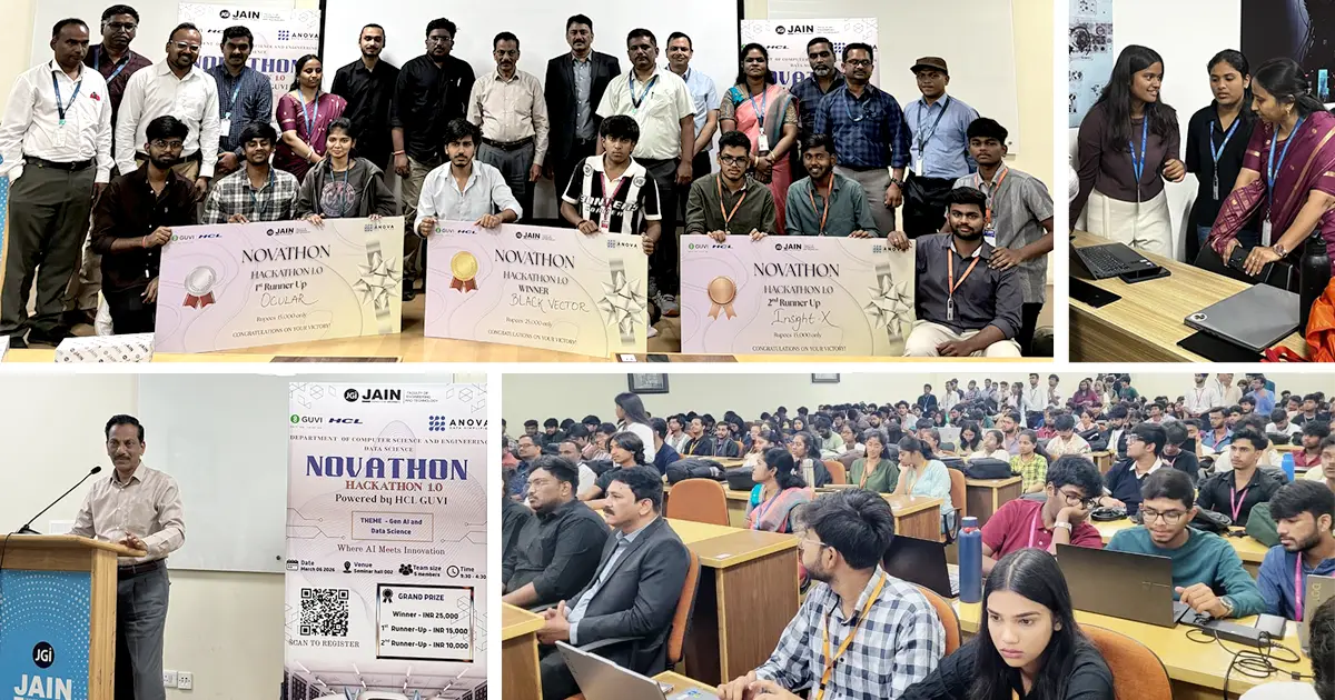 Bengaluru, 6th March 2026: The ANOVA Club of the Department of Computer Science and Engineering - Data Science at Faculty of Engineering and Technology, JAIN (Deemed-to-be University) conducted NOVATHON 1.0, a one-day hackathon focused on Generative AI and Data Science, on 6th March 2026 at FET Block, JAIN Global Campus, Kanakapura Road.